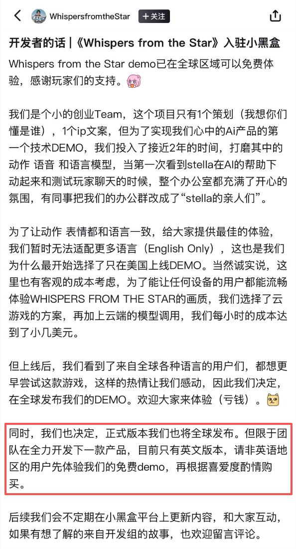 值得一提的是,《Whispers from the Star》的开发团队是蔡浩宇搭建的Anuttacon工作室,同时Anuttacon和《Whispers from the Star》也是Varsapura账号最早期仅有的两个关注。7月22日,工作室层围绕游戏上线问题,发过一则声明,大致意思是:《Whispers from the Star》之所以做到的事情有限,是因为团队正在全力开发下一款产品。